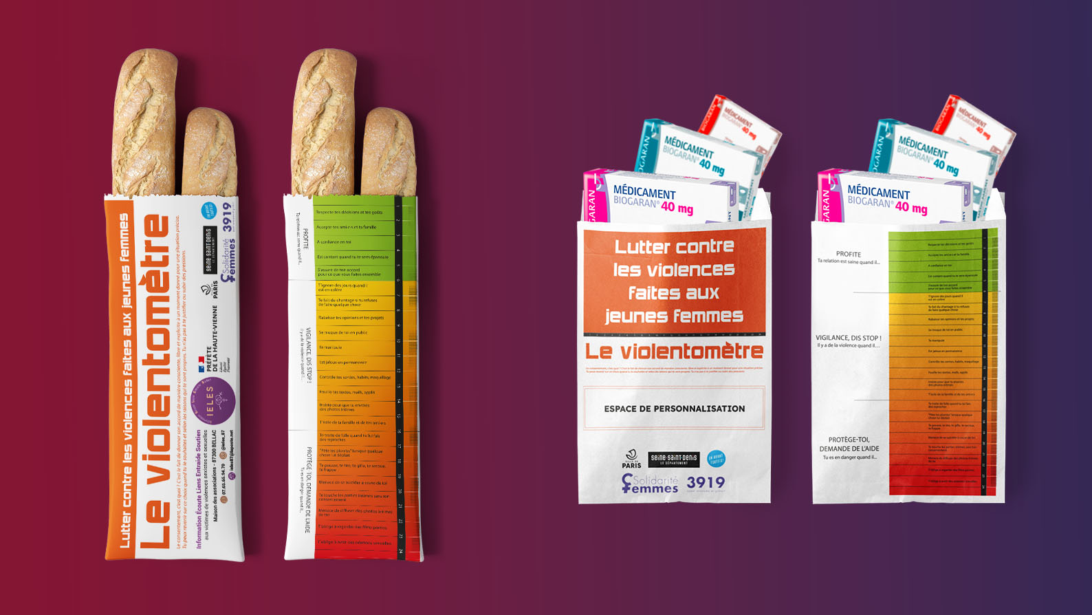 Une diffusion à grande échelle du Violentomètre imprimé sur les sacs à pain et les sacs pharmacies impacte les foyers grâce à nos partenaires Boulangers et Pharmaciens.